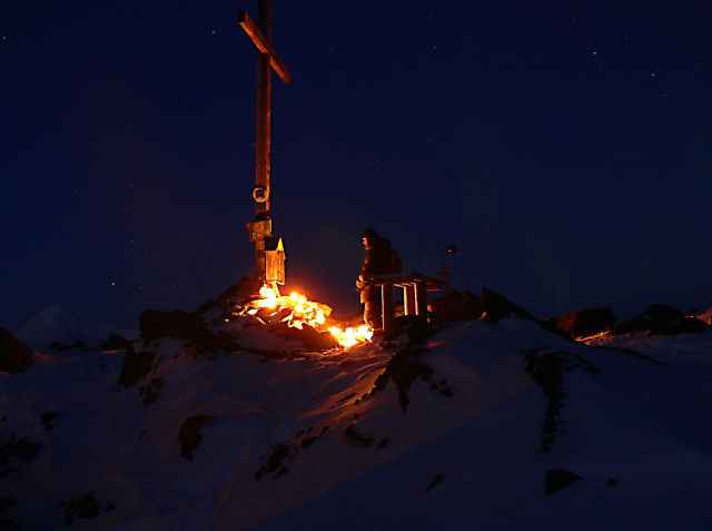 wyróżnia się dopiero po bliższym podpłynięciu, tym właśnie krzyżem. Wyniosła skałka, malutki husik u stóp krzyża. Miejsce dumania z ławeczką u wyblakłej ściany, która zachęca do tego by spocząć. Ale najpierw na skałkę z której widok roztacza się we wszystkie strony. Na drugi brzego fiordu, na Hansa, w głąb na masyw Sofiekammen. Kiedy już jest zmierzch, to znaczy teraz właśnie od kilku tygodni, w oddali jarzą się światła bazy polarnej, jedyny znak ludzki w całym krajobrazie. Morze bez