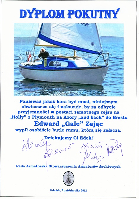 Znacie przysłowie, że każdy dobry uczynek spotka zasłużona kara? W tym duchu postąpiła Rada Armatorska Stowarzyszenia Armatorów Jachtowych - wymierzając zasłużoną karę naszemu drogiemu i cenionemu SAMOTNEMU ZAJĄCOWI NA OCEANIE. Kara jest oryginalna i naśladownictwo - przynajmniej przez SSI - będzie niemile widziane.