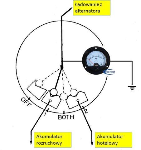 No dobrze. Ale jak ma działać taki układ? Prosto. Do każdego akumulatora podłączamy woltomierz (są one na tyle tanie, że nie warto komplikować sobie życia instalacją dodatkowego przełącznika). Jeżeli jednak chcemy dla oszczędności mieć tylko jeden woltomierz to włączamy go w układ jak na poniższym rysunku.