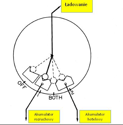 Zaczniemy od najbardziej tradycyjnego, najtańszego i najbardziej uciążliwego wariantu rozdziału zasilania. Bazuje on na jednym alternatorze i przełączniku żargonowo nazywanym 1,2, 1+2.
