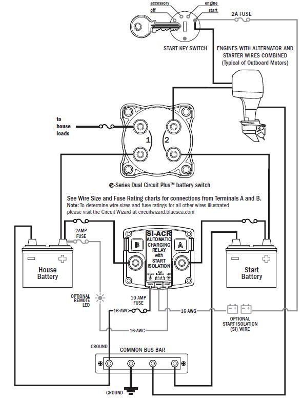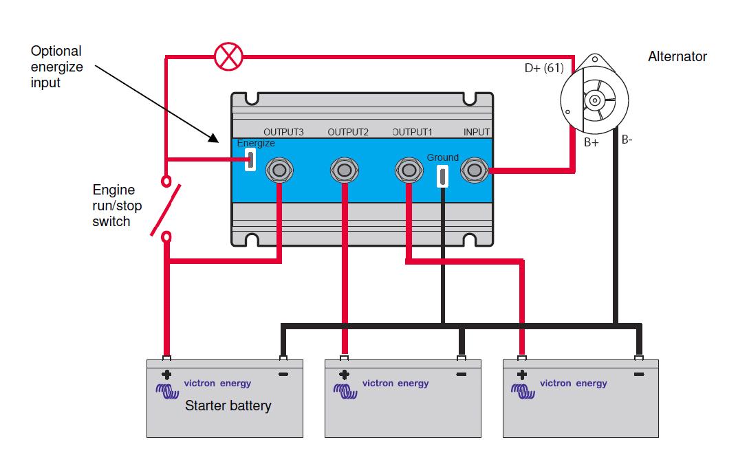 Istnieją również inne i eleganckie (ale nie tanie) rozwiązania. Poniżej przykład separatora bezstratnego Argofet oraz jego sposób podłączenia do instalacji. Podobnie do opisanych wyżej diodowych izolatorów baterii akumulatorowych, izolatory FET pozwalają na jednoczesne ładowanie dwóch albo więcej baterii z jednego alternatora (lub pojedynczego prostownika sieciowego, gdy zasilamy nasz jacht z lądu). Ich zaletą jest to, że w przeciwieństwie do izolatorów diodowych, izolatory FET mają znikome straty napięcia. Spadek napięcia jest mniejszy niż 0,02-0,03 V przy małych prądach i średnio około 0,07 -0,1V na większych prądach. Dodatkowe wyprowadzenie jest niezbędne, aby można było wzbudzić alternator