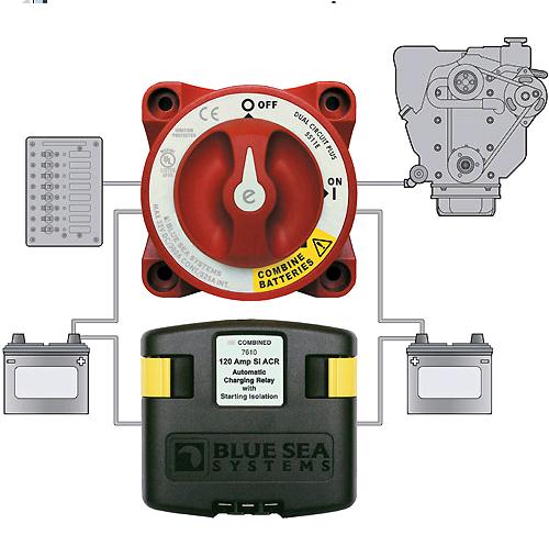 Jak działa taki układ? W czarnej skrzyneczce znajdują się dwa przekaźniki sterowane przez układ pomiaru napięcia. Gdy w zadanym czasie napięcie na akumulatorze rozruchowym osiągnie zadaną wartość przekaźnik odłącza go i załącza ładowanie akumulatora hotelowego. Jednocześnie cyklicznie bada napięcie na akumulatorze rozruchowym. Jeśli spadnie ono – ładowanie zostanie przekierowane do akumulatora rozruchowego. Ponieważ przełączanie odbywa się za pomocą przekaźników nie ma tutaj spadków napięć na zaciskach akumulatora – jak w przypadku separatorów diodowych.