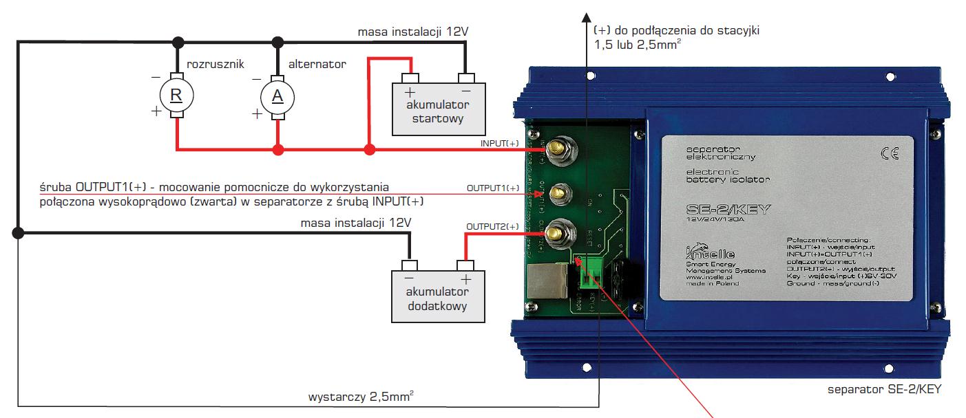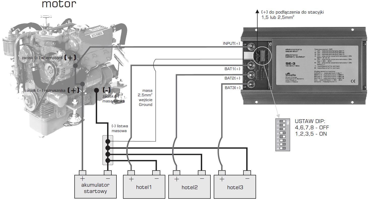 Rysunek 8 Przykład separatora dzielącego prąd na akumulator rozruchowy oraz dwa niezależne akumulatory hotelowe