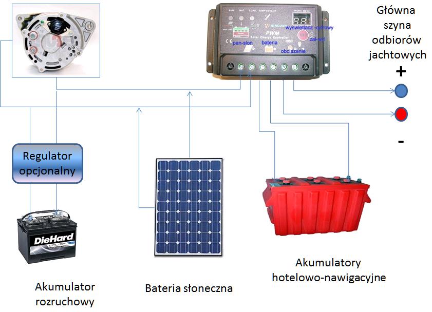 Wobec taniości i dobrej jakości regenerowanych alternatorów w Polsce (które przy okazji łatwo jest zmarynizować) jest to rozwiązanie, które ze względu na niezawodność wynikającą z prostoty uważałbym za optymalne. Oczywiście ich moc powinna być różna. Alternator główny rekomendowałbym jako 90-120 A. (przy pojedynczym – 150 A), a dla rozruchowego maleństwo 35-45 A (np. od Kuboty 722). Akumulatory żelowe ładujemy przez rekomendowany wyżej sterownik PWM.
