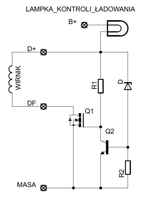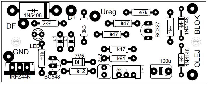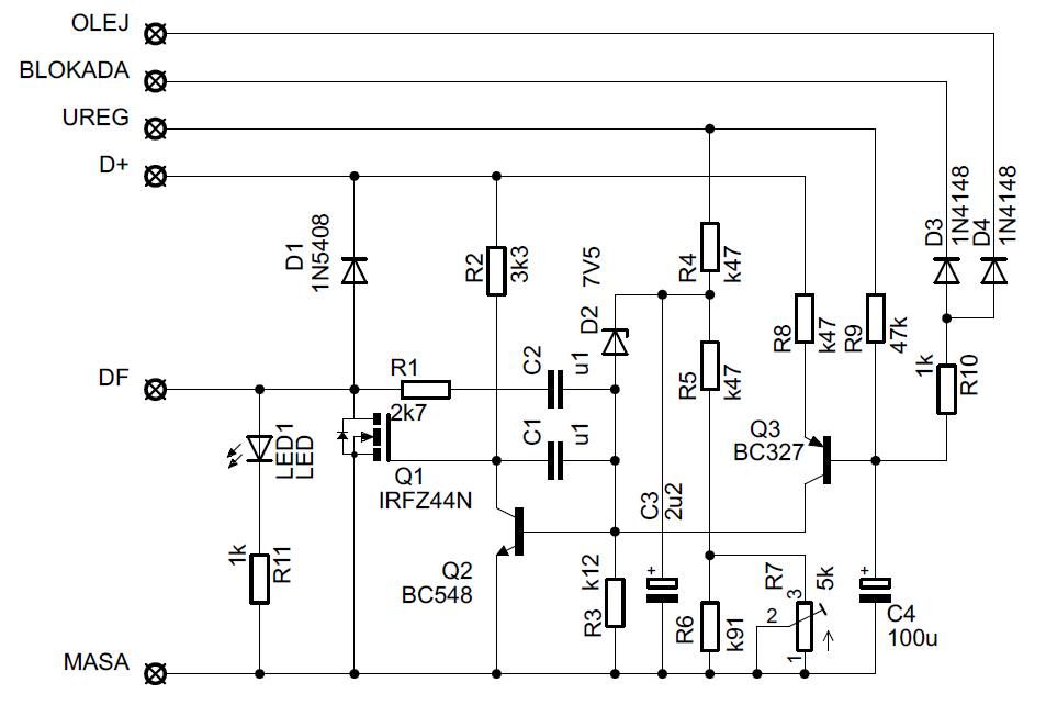 Zaproponowany układ wymaga wyprowadzenia z alternatora zacisku obwodu wzbudzenia standardowo oznaczanego DF. W zacisk ten wyposażone są wszystkie alternatory przystosowane do pracy z zewnętrznym regulatorem. Niestety znaczna część nowoczesnych alternatorów samochodowych wyposażona jest w integralne, scalone regulatory umieszczone w ich konstrukcji.