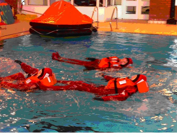 PŁYWALNIA; W środę bladym świtem udaliśmy się na pobliską, usytuowaną tuż obok Akademii Morskiej pływalnię, na której doświadczyliśmy empirycznie zakładania pasów ratunkowych na głębokiej wodzie, skakania z wieży i pływania w tychże, także przebywania w kombinezonach ratunkowych, wchodzenia i odwracania przewróconej tratwy ratunkowej. Bardzo przydatnym - w zagrożeniu hipotermią - wydał się być sposób łączenia się „rozbitków” w kilkuosobowe grupy (leżąc na plecach bierzemy pod pachy nogi poprzednika, tworząc coś w rodzaju wodnego pociągu), które wiosłując rękoma podążają w obranym kierunku. Należy podkreślić, iż w opinii większości kursantów zajęcia te były jednymi z najwyżej ocenianych jako wyjątkowo przydatne w ewentualnych kryzysowych sytuacjach.