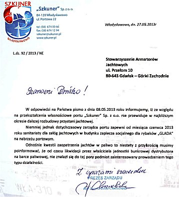 Stowarzyszenie Armatorów Jachtowych w Gdańsku pragnie podziękować za odpowiedź na pismo z 8 maja br. Z żalem przyjmujemy informację o braku planów rozbudowy przystani jachtowej.