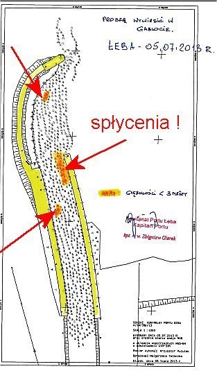 Dominik Cyranowicz znowu podsyła aktualny sondaż wejscia do portu Łeba (05.07.2013). O odwiecznym, nieustającym i niekończacym się procesie powstawania spłyceń rozwodziłem się bardzo szeroko w locyjce "Polskie porty otwartego morza". Sprawa jest prosta - w tym miejscu żadnego portu być nie powinno. Zarozumieli ludzie chcieli postawić na swoim, ale chyba łatwiej by było w naszym klimacie zbudować trwały dom na lodzie.