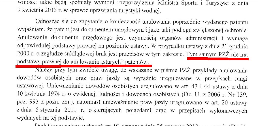 Szanowny Dyrektorze Panie Piotrze Kudelski, w związku z żądaniem przez Polski Związek Żeglarski oryginału patentu żeglarskiego w celu uzyskania/ wymiany na nowy patent żeglarski ( na podstawie aktualnego rozporządzenia z 2013 roku), zwracam się z prośbą o informację na jakiej podstawie prawnej PZŻ niszczy stary patent żeglarski przecinając go i odsyłając właścicielowi zniszczony, gdy ten jest dokumentem, którego ważność jest bezterminowa?