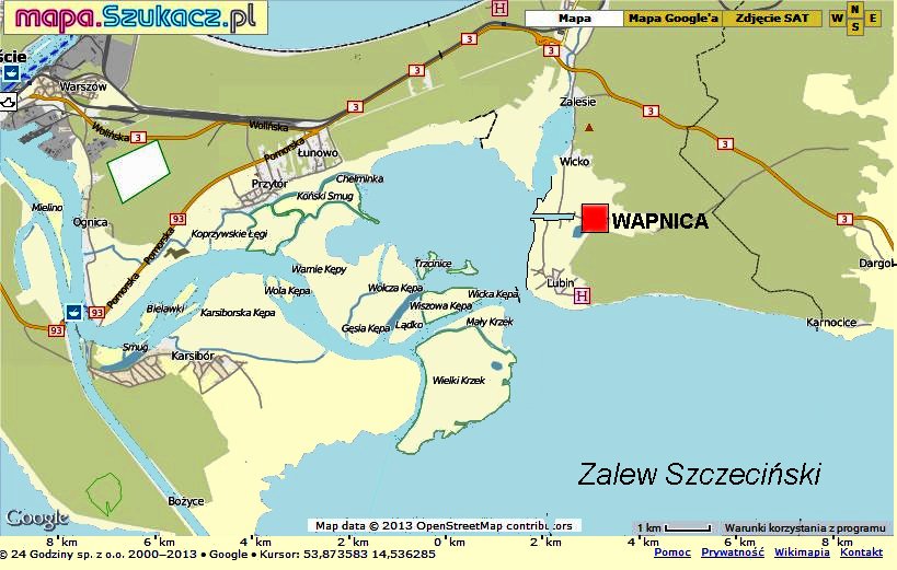 Dwa miesiące temu nad Zalewem Szczecińskim pojawiła się mała, urocza perełka – port jachtowy w Wapnicy (53°52’50”N 14°25’31”E). Zlokalizowany jest na wschodnim brzegu jeziora Wicko Wielkie w północnej zatoce Zalewu Szczecińskiego, w estuarium Odry. Podchodzimy do niego wyłącznie w porze dziennej trzymając się bardzo ściśle toru podejściowego – chociaż na głowicy falochronu są dwa światła (migające ISO prawdopodobnie 2 sek. – proszę Kolegów o zweryfikowanie, które nie było możliwe od stron lądu). Naszym płytkim „Donaldem” (1.05 m) otarliśmy się o krawędź mielizny, gdy tylko zeszliśmy ze szlaku.