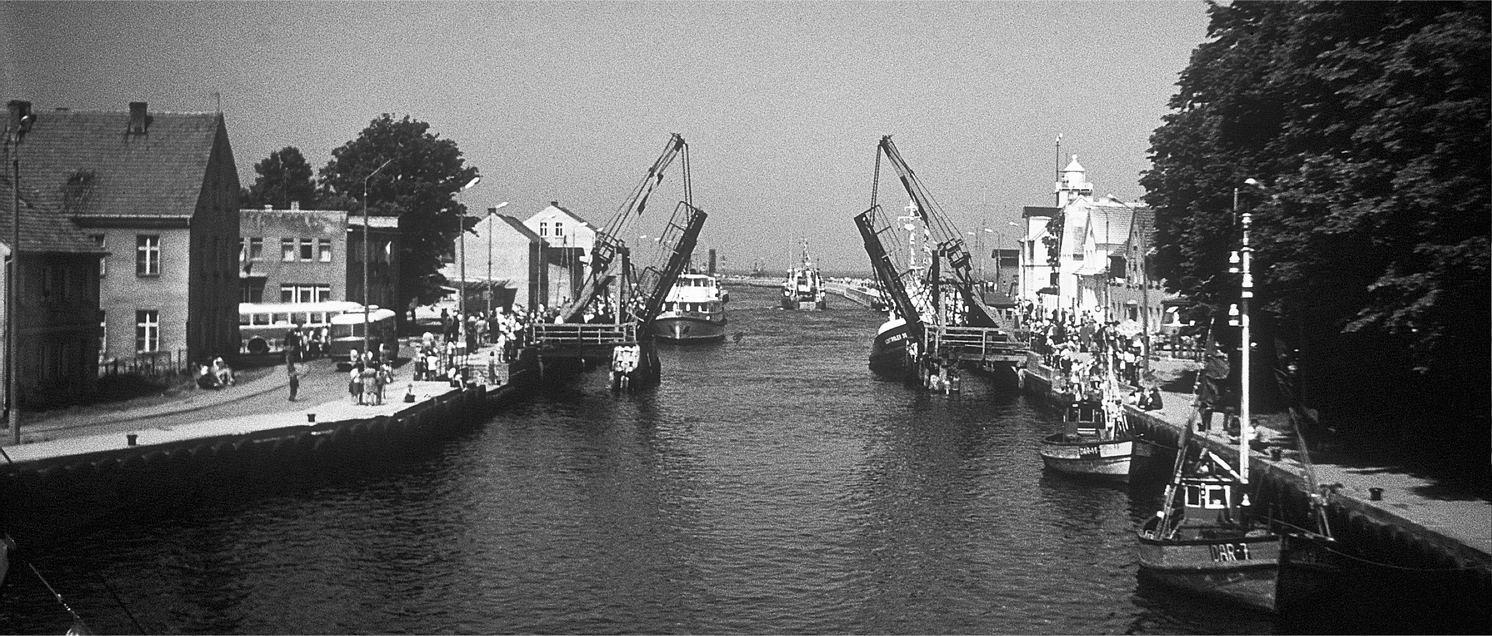 Letnicy się wykazali, doczekalismy się z nimi następnego otwarcia mostu. Popłynęliśmy w górę rzeki do miasta. Zrobiło sie ciemno, wiatr stężał, zaczął padać deszcz. Osiągnęliśmy rozwidlenie koryta rzeki i Basenu Przemysłowego. Gdzie się tu przechować? Zgodnie wybraliśmy zachodnie wysokie nabrzeże Wieprzy, jakieś 100 m przed kładką dla pieszych (kładki obecnie już nie ma). Wysokie nabrzeże zasłoniło nas przed wiatem i deszczem. Staliśmy jak u Pana Boga za piecem.