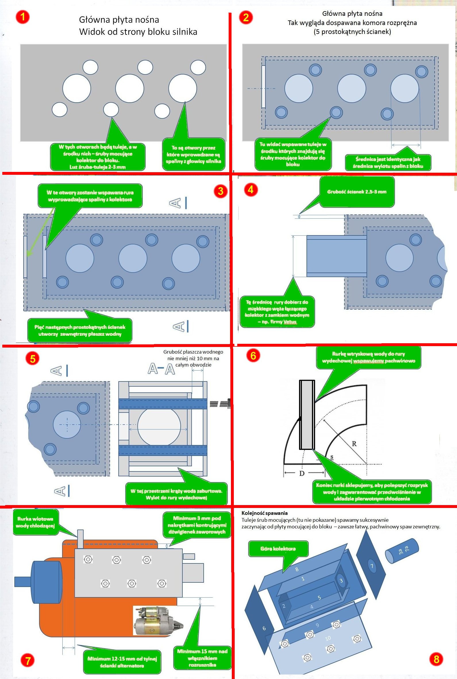 e. Mamy pewną komorę rozprężną. Teraz spawamy ścianki 6, 7, 8, 9, 10 i oczywiście na ściance nr 10 obspawujemy (znów zewnętrznie) tuleje śrub mocujących. Jest to łatwe, bo zadbaliście o to, aby wystawały 3 mm nad powierzchnię ścianki.