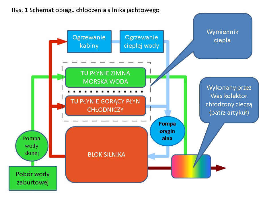 Dla kolegów, którzy chcieliby wykonać samodzielnie wymiennik i zintegrować go z kolektorem chłodzonym wodą zaburtową podaje adres opracowania, gdzie znajdziecie stosowne wzory: http://www.google.pl/url?sa=t&rct=j&q=&esrc=s&source=web&cd=5&ved=0CDwQFjAE&url=http%3A%2F%2Fwww.pg.gda.pl%2Fchem%2FKatedry%2FKaimch%2Fimages%2Fstories%2FKatedra_AiMCh%2Fwymiennik.pdf&ei=5GxjUveFLIeN0AX89IDAAw&usg=AFQjCNH4z4z1iuxGH-26q3n3Vq5wuXwDfg&sig2=X6ebsCPMZbfUH9xHy0LFWg&bvm=bv.54934254,d.d2k&cad=rja .