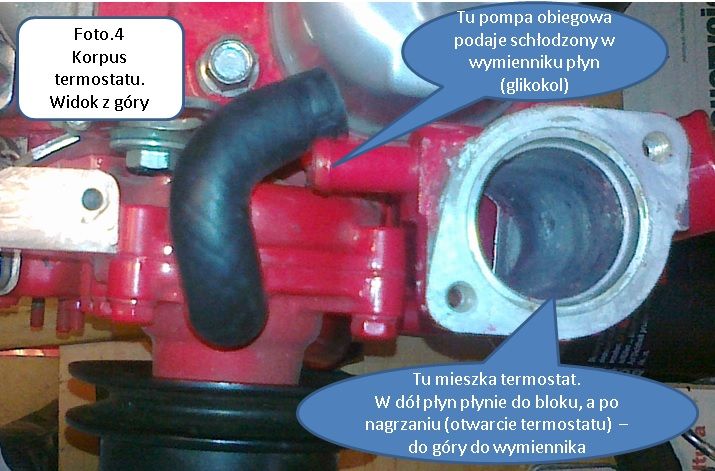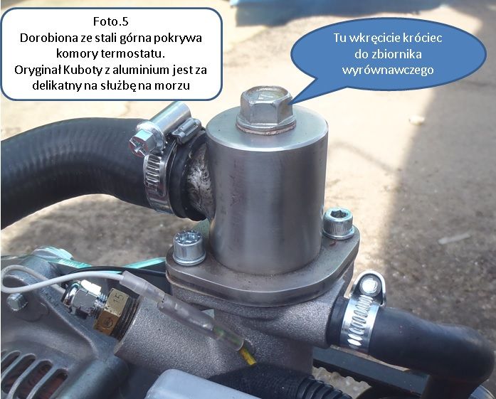 Jaki model kupić? Jako sprawdzony w praktyce morskiej polecam Wam wymiennik basenowy wykonany ze stali 316L. Na fotografii 2 (jest własnością firmy LEDNET z Szydłowca) pokazana jest jego konstrukcja wewnętrzna. Jak widać rdzeń wymiennika tworzą ciasno upakowane, karbowane rurki ze stali nierdzewnej. Płynie w nim glikol ogrzewany w bloku silnika Są zanurzone w płynącej wodzie morskiej, która dopływa przez boczne króćce. Na rysunku nr 3 pokazujemy Wam jak włączyć wymiennik w instalacje. Ważne jest, aby nie pomieszać podłączeń. Jeżeli silnik się grzeje po uruchomieniu i odpowietrzeniu instalacji, to tutaj szukajcie pierwszych podejrzanych. Na fotografii nr 4 pokazano jak wygląda komora termostatu. Jak widać wchodzi do niej podany przez napędzaną paskiem klinowym pompę schłodzony płyn płynąc wprost do bloku (w dół) . Gdy osiągnie właściwą temperaturę termostat otworzy się i płyn popłynie w górę – do specjalnie dorobionego kominka (Foto.5). Tam wyprowadzony poziomym przewodem trafi do wymiennika. Ciśnienie w układzie jest utrzymywane przez zbiornik wyrównawczy, którego nie widać na fotografii. Zbiornik podłączany jest przez króciec wkręcany pionowo w kominek (tam gdzie na fotografii tkwi śruba).