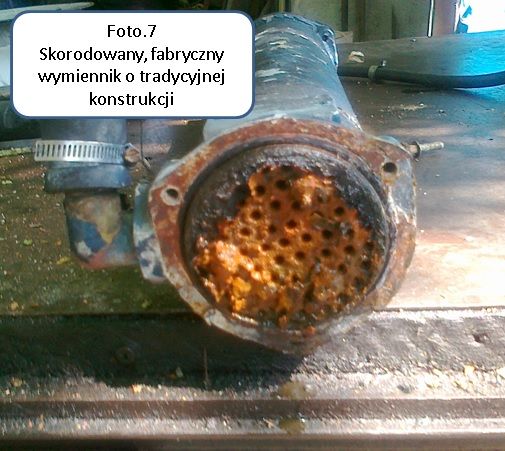 j. Jeżeli kupiliście 20-30 letni jacht w Szwecji czy Holandii to będzie on prawdopodobnie w bardzo dobrym stanie. Ale z dużym prawdopodobieństwem po rozebraniu wymiennika zobaczycie coś takiego, jak na fotografii nr 7. Nie czyście i nie naprawiajcie go. Nowy, opisywany wymiennik kosztuje od 250 do 500 zł – a zapewni Wam spokój na następne 20-30 lat. Co 5 sezonów część słoną musicie jedynie przepłukać pod ciśnieniem słodką wodą z detergentem – to usunie osadzone glony i przywróci sprawność działania.