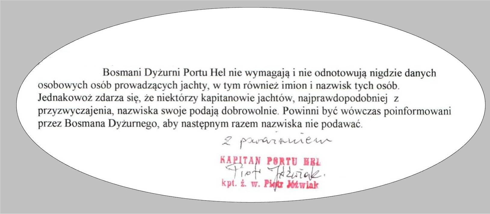 Z satysfakcją i zadowoleniem przyjmujemy zwłaszcza ostatni akapit Pańskiej odpowiedzi. Przepisy Portowe są nam znane. Nasza prośba o wyjaśnienie podstawy prawnej dla żądania podawania nazwiska prowadzącego i innych danych osobowych wynikała z naszych licznych, osobistych doświadczeń. Wbrew temu co czytamy w Pańskiej odpowiedzi, w helskim porcie wielokrotnie żądano od osób prowadzących jachty podawania nazwisk w trakcie korespondencji radiowej przed wejściem do portu. Żądano tego zarówno od członków naszej organizacji jak i wobec innych prowadzących jachty. Mamy nadzieję, że niniejsza korespondencja zakończy tą dziwną praktykę, uprawianą przez niektórych z bosmanów dyżurnych portu Hel.