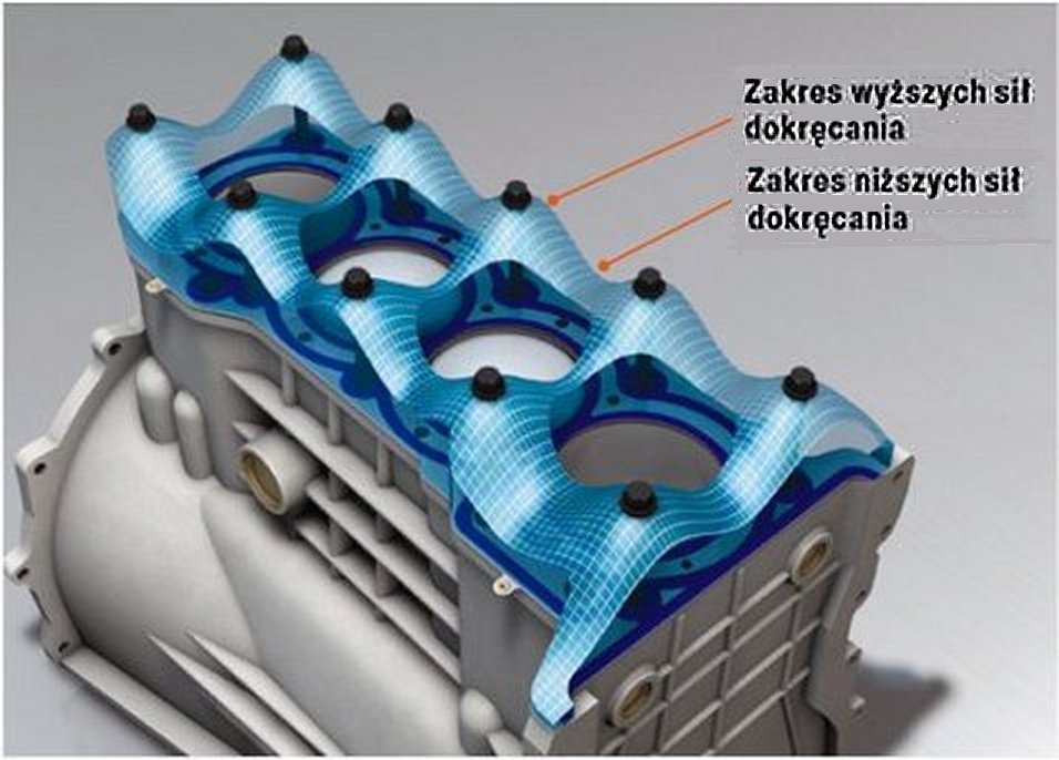 Teraz odkręcamy głowicę. Ale uwaga: w książce serwisowej sprawdzamy kolejność dokręcania krzyżowego śrub i w odwrotnej kolejności luzujemy śruby głowicy (luzujemy – nie odkręcamy do końca!). Mimo, że wielu warsztatach nie zwraca się na to uwagi, to nie jest trudno pokrzywić głowicę przez nieumiejętne odkręcanie (podobnie jak i dokręcanie). W głowicy następują bardzo duże i nierównomierne naprężenia – o rozkładach jak na fotografii.