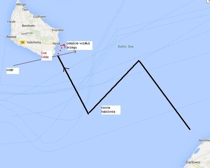 Niestety, tego ranka lotniczej radiolatarni Rǿnne nie byłem w stanie złapać. Manipulowałem pokrętłem radyjka, kręciłem w prawo i w lewo...nic.. Jak tak dalej pójdzie, to wjedziemy w ląd. Odpadamy, musimy iść wzdłuż wybrzeża, które być może jest przed nami, lekko odchodząc, a nie zbliżając się do niego. – „Sternik, odpadaj na kurs 0300”. A co, jeśli już minęliśmy Dueodde i po odpadnięciu kierujemy się prosto na cypel położony na północny wschód od nas? Nieee, to niemożliwe, tacy szybcy nie jesteśmy.