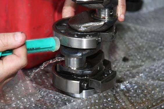 Właściwą pracę zaczynamy od starannego umycia dwóch krytycznie ważnych części – wału korbowego oraz bloku silnika. Teoretycznie wał powinien wrócić czysty z obróbki mechanicznej. Ale długoletnia praktyka warsztatowa mówi, że czasami wraca, a czasami nie. Niekiedy płucząc acetonem kanały olejowe z przerażeniem stwierdzicie, że z otworków wypłynęły nie tylko resztki starego oleju, ale też małe stalowe wiórki – które w oka mgnieniu potrafią uszkodzić delikatne, miękkie powierzchnie panewek. Mogą się tam dostać wraz z chłodziwem maszyny szlifierskiej – tak, czy tak, lepiej załóżcie że kanalikach olejowych siedzi złe i lepiej je stamtąd wygonić. Oto trick warsztatowy pokazany na fotografii (patrz podpis). Zwróćcie uwagę, że wykonuje płukanie na foli bąbelkowej. To nie przypadek. Te błyszczące, okrągłe powierzchnie to utwardzane i szlifowane tarcze podpór wału. Przenoszą nie małe obciążenia – zwłaszcza, gdy silnik pracuje na wolnych obrotach z dużym obciążeniem. Mała rysa na nich może wywołać ich pęknięcie na skutek zjawiska karbu. Tak ukręcił nam się wał z podrasowanym mocno silniku gokarta. Ryska była maleńka – powstała gdy koledze wymknęły się z ręki szczypce do pierścieni Segera. Była tak mała, że wypatrzyliśmy ją dopiero przez okulary pożyczone od asystującego nam dalekowidza. No i machnęliśmy na nią ręką przed zawodami, bo i tak byliśmy wykończeni. Przy czwartym starcie (z pięciu) wał się ukręcił – został idealnie ścięty wzdłuż tej rysy….
