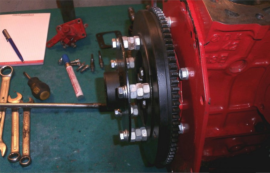 Zdjęcie, przedstawiające zamocowanie tulei zębatej na kole zamachowym do połączenia z przekładnią s-drive wykonane przez wspomniany wyżej warsztat partacza.