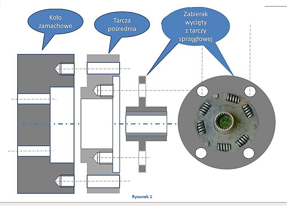 W tarczy dystansowej wykonane jest kolejne podtoczenie, które osiuje tarcze zabieraka wykonaną ze stoczonej tarczy sprzęgłowej. Widoczne na rysunku sprężyny są elementem tłumika drgań skrętnych minimalizując obciążenie kół zębatych przekładni redukcyjno-nawrotnej w chwili włączania biegu.