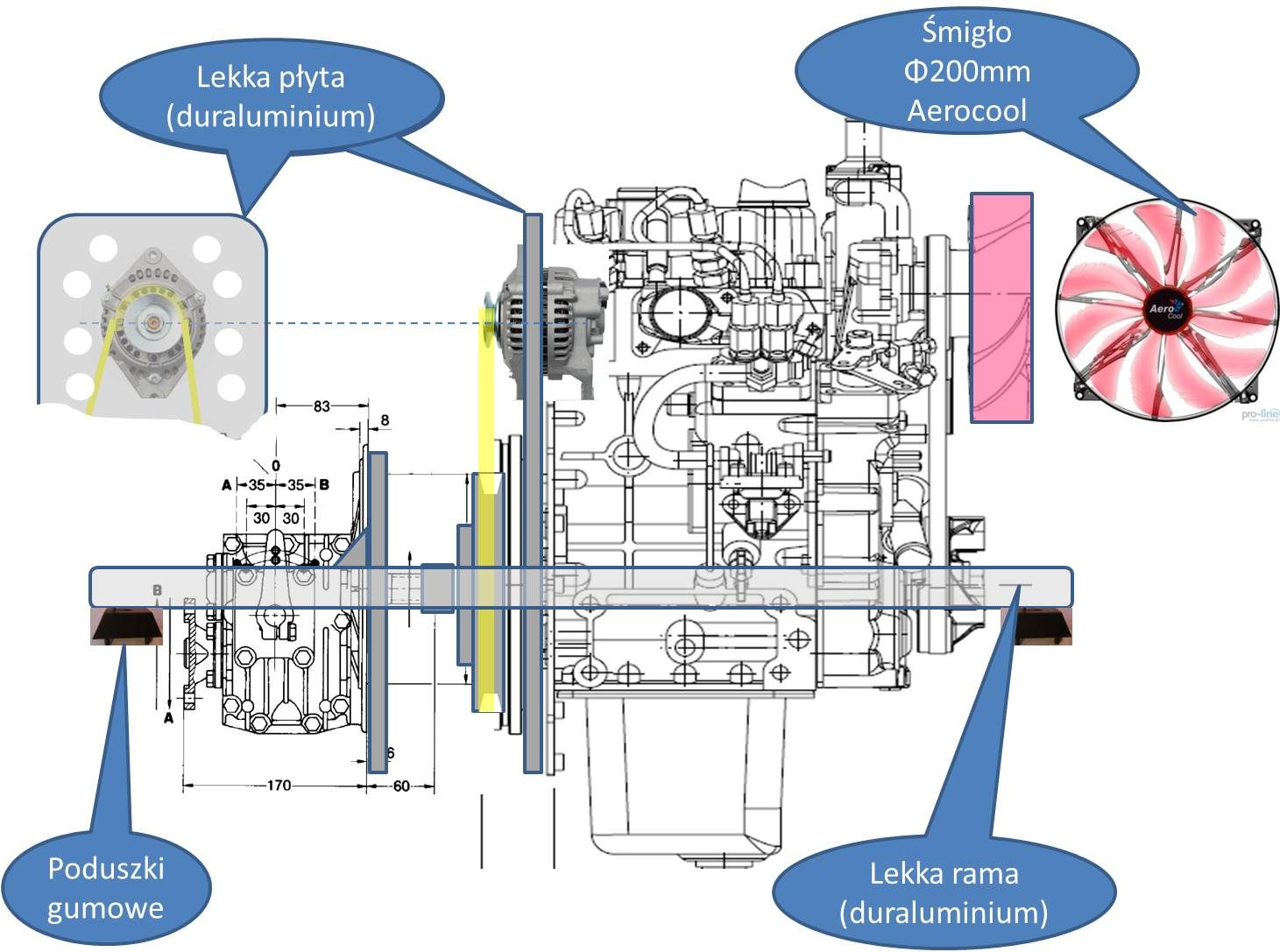 Ktoś dociekliwy może zauważyć, że wymiana pasków klinowych jest tutaj utrudniona w porównaniu z odbiorem napędu z przodu. To prawda. Ale przy przemyślanej konstrukcji odkręcenie 4 śrub mocujących tarczę zabieraka i cofnięcie tulei w kierunku skrzyni nie jest żadnym problemem – zwłaszcza, jeśli będziemy pamiętali, że mamy klucz z grzechotką. I już mamy jak włożyć pasek lub paski. Zwróćcie uwagę, że sugeruje montaż na wałku napędu oryginalnej pompy wodnej specjalnego wentylatora. Ma średnicę 200 mm jest zamknięty w zabezpieczającej ramce, którą nie jest trudno przymocować do bloku silnika. Pochodzi z komputera. Trzeba z niego zdemontować oryginalny silnik i zastąpić go piastą z otworami. Niekoniecznie musicie podłączać wbudowane oświetlenie czerwonymi diodami – wygląda tak psychodelicznie, jakby żywcem zostało przeniesione z Oddziału Rozwoju Nerwic dla Młodzieży.