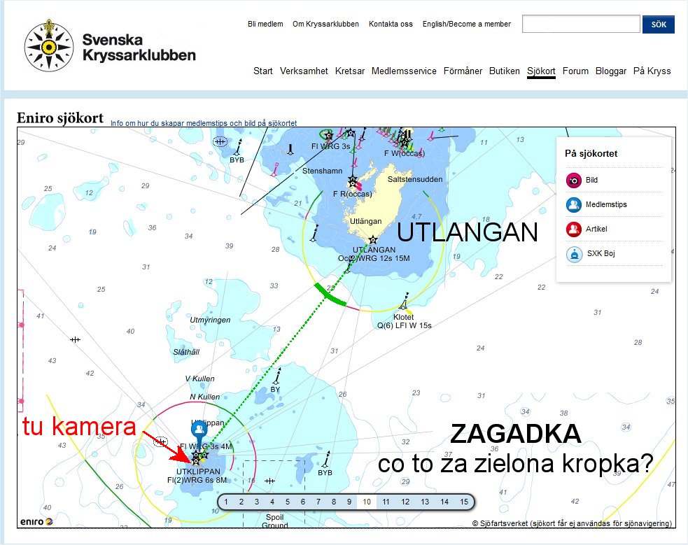 Webcamera umieszczona na latarni wysepki Utklippan "widzi" zielony sektor latarni (tłusty druk w Spisie Świateł) UTLANGAN (56 00 8 N i 015 00 47 4 E) o charakterystyce Oc(2)WRG 12s. Zasięg maksymalny zielonego światła 10M, sektor od 22,5 do 53,0. Latarnia Utlangan to cylindryczna czarno-biała wieża (w spisie: white tower, black top) stojąca na S skraju wysepki o tej samej nazwie. Odległość od webcamery Utklippan - około 4,6 M, namiar, około 040 stopni.