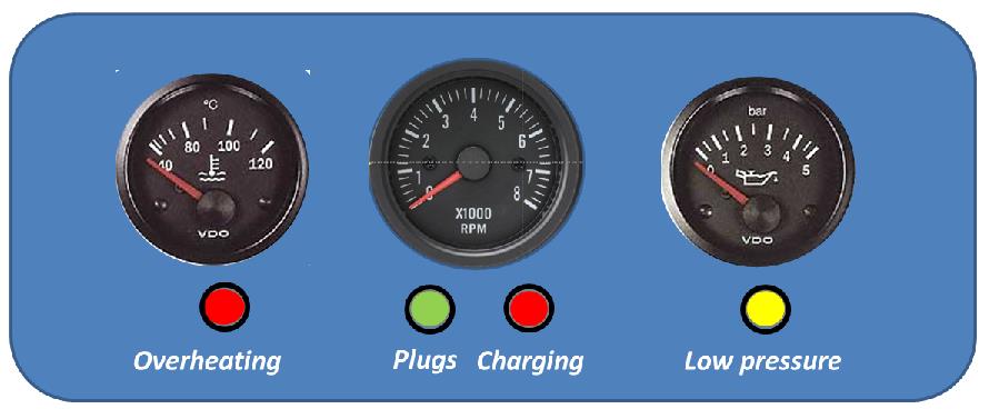 Warunkiem zbudowania w pełni zabezpieczonej tablicy jest staranne rozdzielenie funkcji odczytu wskaźników, odczytu mierników oraz włączników. Najpierw zajmiemy się najtrudniejszą częścią, czyli wykonaniem tablicy wskaźników, która da nam poczucie pełnej kontroli nad pracą marynizowanego silnika. Wykorzystamy tutaj najtańsze klasyczne wskaźniki typu VDO – wykorzystywane w tuningu samochodowym. Kosztują w granicach 50-100 zł za sztukę (są bardzo duże różnice cenowe pomiędzy sklepami za ten sam wskaźnik). ALE UWAGA! ŻADEN Z NICH NIE ZNIESIE EKSPOZYCJI NA WARUNKI MORSKIE. Niestety, ich (podobno) wodoszczelne odpowiedniki kosztują średnio 5 razy więcej. Kwadratura koła? Niekoniecznie. Oto pomysł na trwałą tablicę. Zaczynamy projektowanie od decyzji ile wskaźników zastosujemy, zaczynając od wersji minimum. Optymalną średnicą (z praktyki) jest standard 52 mm. Jako minimum na mały jacht proponowałbym trzy wskaźniki oraz cztery lampki kontrolne – rys. 1.