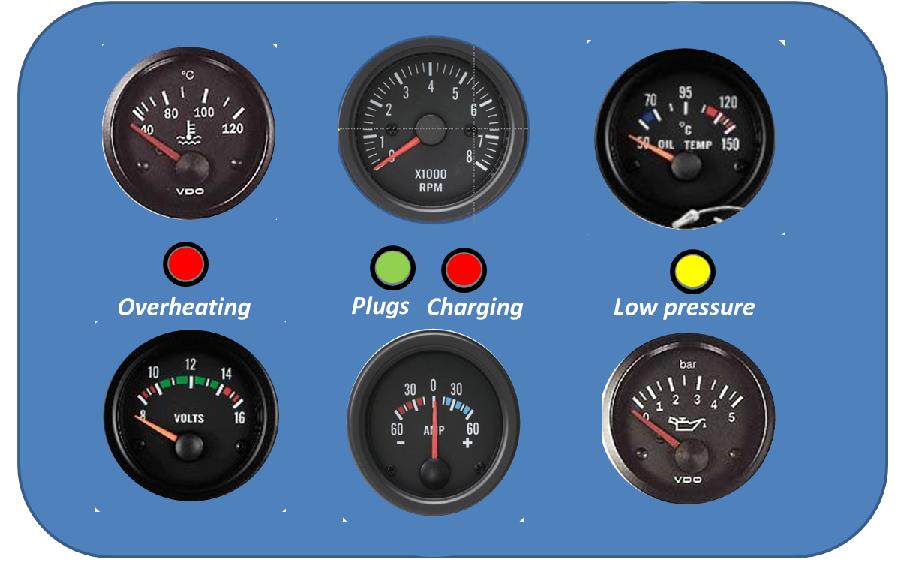 Po lewej stronie proponuje umieścić wskaźnik temperatury wody, a pod nim lampkę kontrolną przegrzania silnika. Jak zbudować instalację – za chwilę. Po środku dobrze jest umieścić obrotomierz. Wielu żeglarzy traktuje go jak fetysz – jednak wydaje mi się, że jest on najmniej potrzebnym wskaźnikiem, gdyż po krótkim czasie Wasze ucho będzie w stanie ustalić optymalne obroty silnika z dokładnością lepszą niż +- 25 obr./min – a więc w granicach błędu odczytu obrotomierza. Pod obrotomierzem – lampka ładowania alternatora.