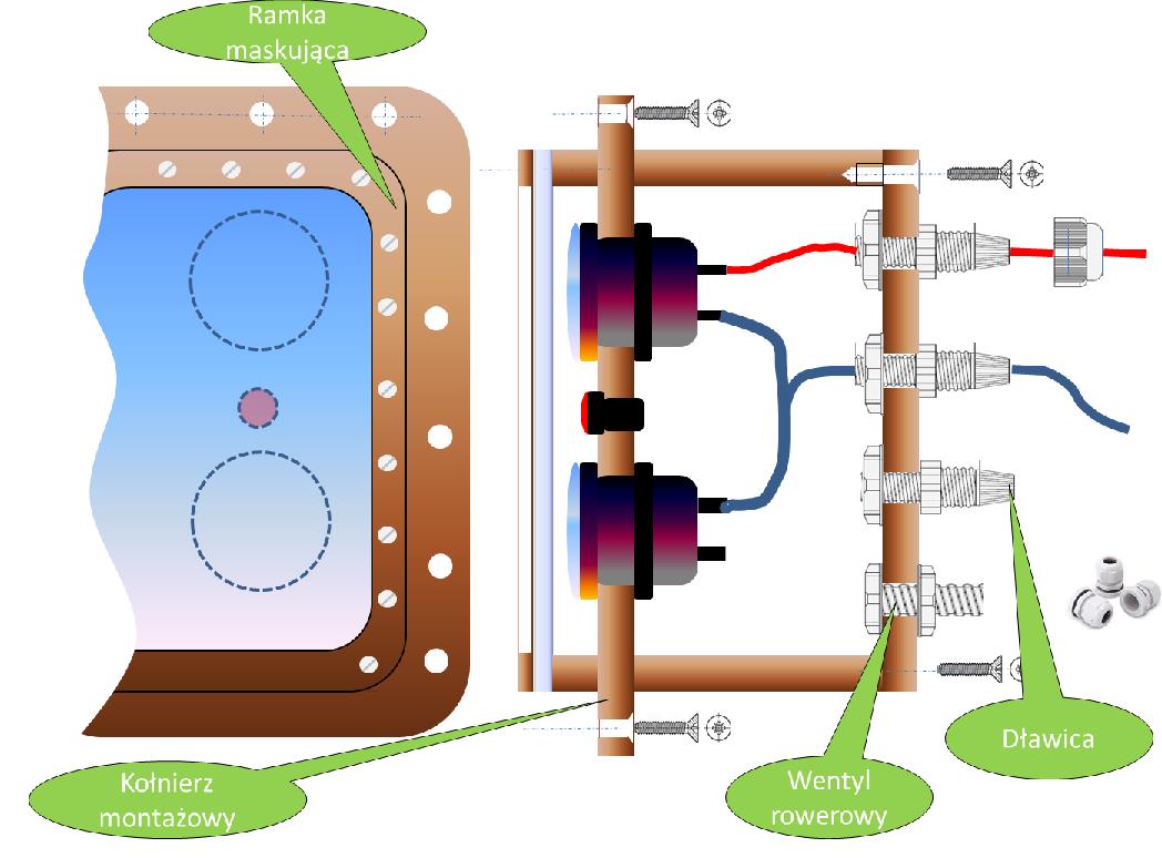 3. Montujemy wskaźniki oraz lampki kontrolne na płycie głównej i wsuwamy ją do środka naszej kwadratowej rury (skrzynki)
