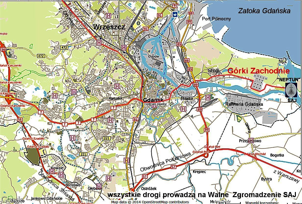 Napewno na parkingu przystani JKM "NEPTUN" zobaczymy wiele samochodów. Dla tych, którzy wybierają się do nas po raz pierwszy - mapka "wszystkie drogi na Walne SAJ". Może się zdarzyć, że ktoś przyjedzie do Gdańska pociągiem lub "PolskimBusem" (rezerwacje róbcie już !). Dla nich informacja o miejskim transporcie autobusowym: autobus ZTM "111" z Dworca PKP Gdańsk Główny - 20-ty przystanek (końcow y, pętla) dalej 400 metrów pieszo (po lewej Rozlewisko Wisły Śmiałej, po prawej stocznie) w kierunku S do bramy JKM "NEPTUN". To stary, spory, dobrze zorganizowany jachtklub armatorski, który dekadę temu opuścił struktury PZŻ. Stowarzyszenie Armatorów Jachtowych ma tu swoją oficjalną siedzibę jako gość.