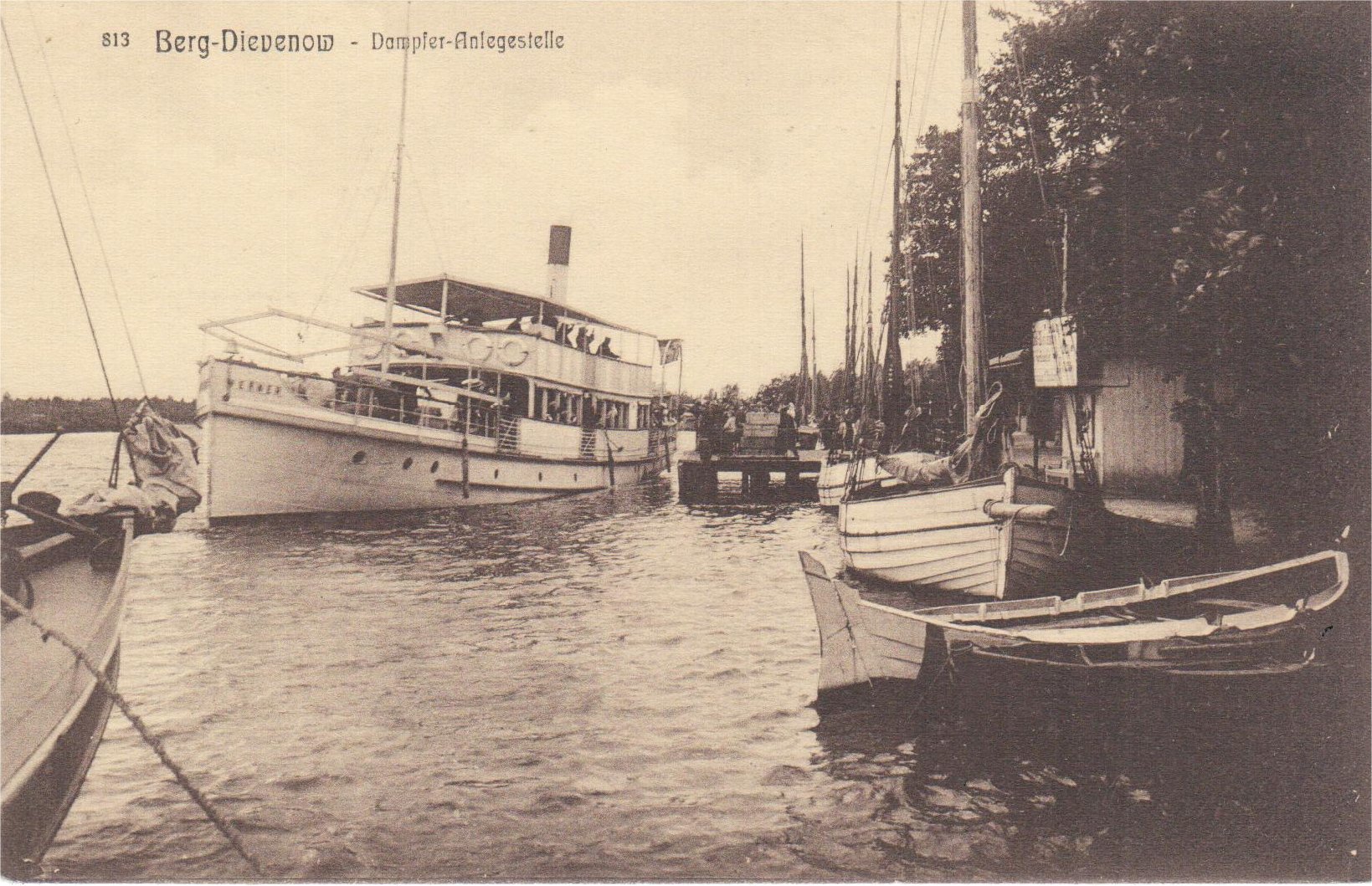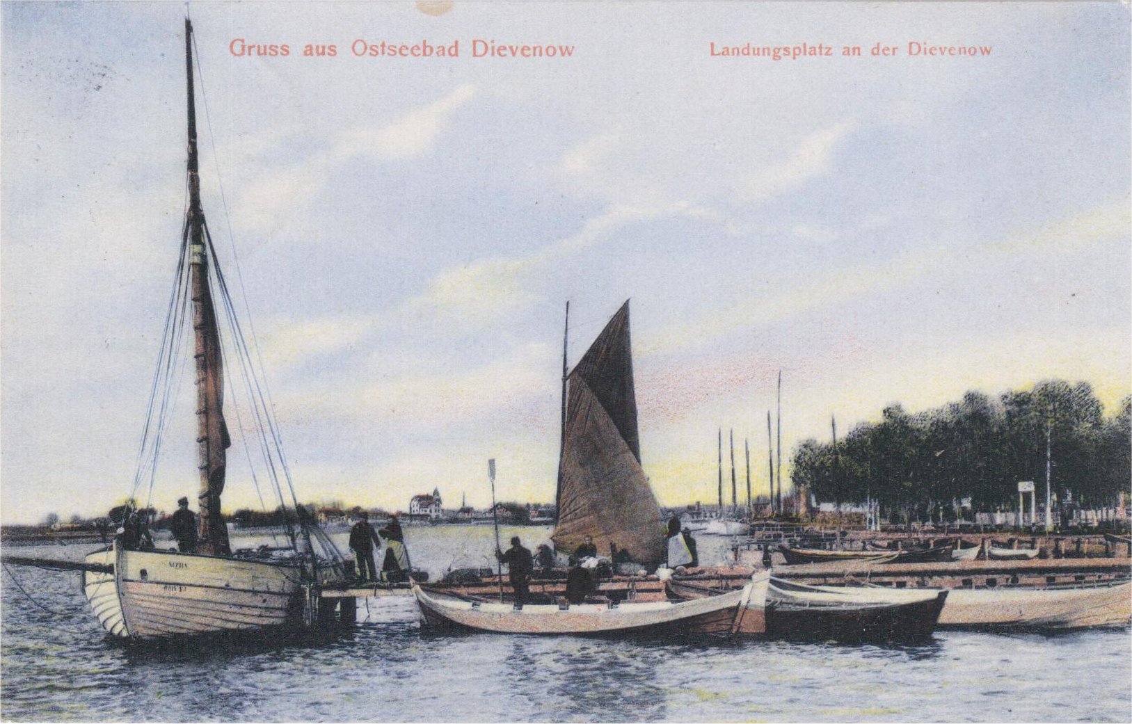Pierwsza czarno-biała (Lichtdruck von Trau & Schwab, Dresden 19). Całkiem spory parowiec „białej floty” raczej odpływa od pomostu przystani w Górnym Dziwnowie – cumy już oddano, a do pomostu pewnie ze dwa metry. Na pomoście kilkanaście żegnających osób i jakieś kosze (walizy podróżne?). Na dziobie można odczytać nazwę „Werner”. S/s „Werner” zapewne popłynie do Szczecina, a może nawet Berlina. W prawym rogu pocztówki spory, drewniany, jacht (?), kuter (?), służący do lokalnej komunikacji, lub może wycieczek po Dziwnie i na morze. Z wysuwanym bukszprytem, pięknej budowy – na zakładkę (6 planek); teraz takich się nie widuje! Za nim w tle jeszcze jeden podobny, a za pomostem jeszcze pięć masztów! Przed jego dziobem czterowiosłowa szalupa o kształtach typu „szpicgat”. Natomiast w lewym rogu wystaje – to już ani chybi – jacht! Na krótkim bukszprycie, na forsztagu fok, na pokładzie spora, rozłożona, kotwica admiralicji – gotowa do użycia, wysokie nadburcie, ale cuma prowadzona jest niezbyt fachowo (?!).