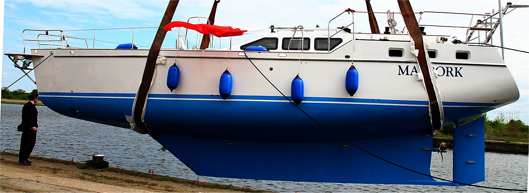 Zbudowano nowy jacht oceaniczny według projektu samego Bruce Robertsa. Juz nazwisko Mistrza powinno zamknąc mi gębę. Ale ja sobie troche pofolguję - nie ma co ukrywać, że nawet najwięksi projektują, to co jest aktualnie "trendy", czyli to, za co klient natychmiast zapłaci. A dzisiejszy klient juz nie zadawala się "wysokością stania" i chce mieć na jachcie cztery niekrępujace kabiny z trzema toaletami i "z osobnymi prysznicami (?)". No i oczywiście ster strumieniowy na dziobie. Jacht jest stalowy, ale krągłości poszycia wygladają całkiem laminatowo. Do tego - jak się błyszczy. Juz starożytni Rzymianie coś wspominali o pekunii, która nie oletuje, a ja bezczelnie przywołam jeszcze inne starożytne stwierdzenie, że de gustibus etc.s/y "MALBORK" w Malborku. Dnia 27.04.2014 W Malboku, po 2,5 latach budowy ochrzciliśmy i zwodowaliśmy jacht o imieniu "MALBORK"