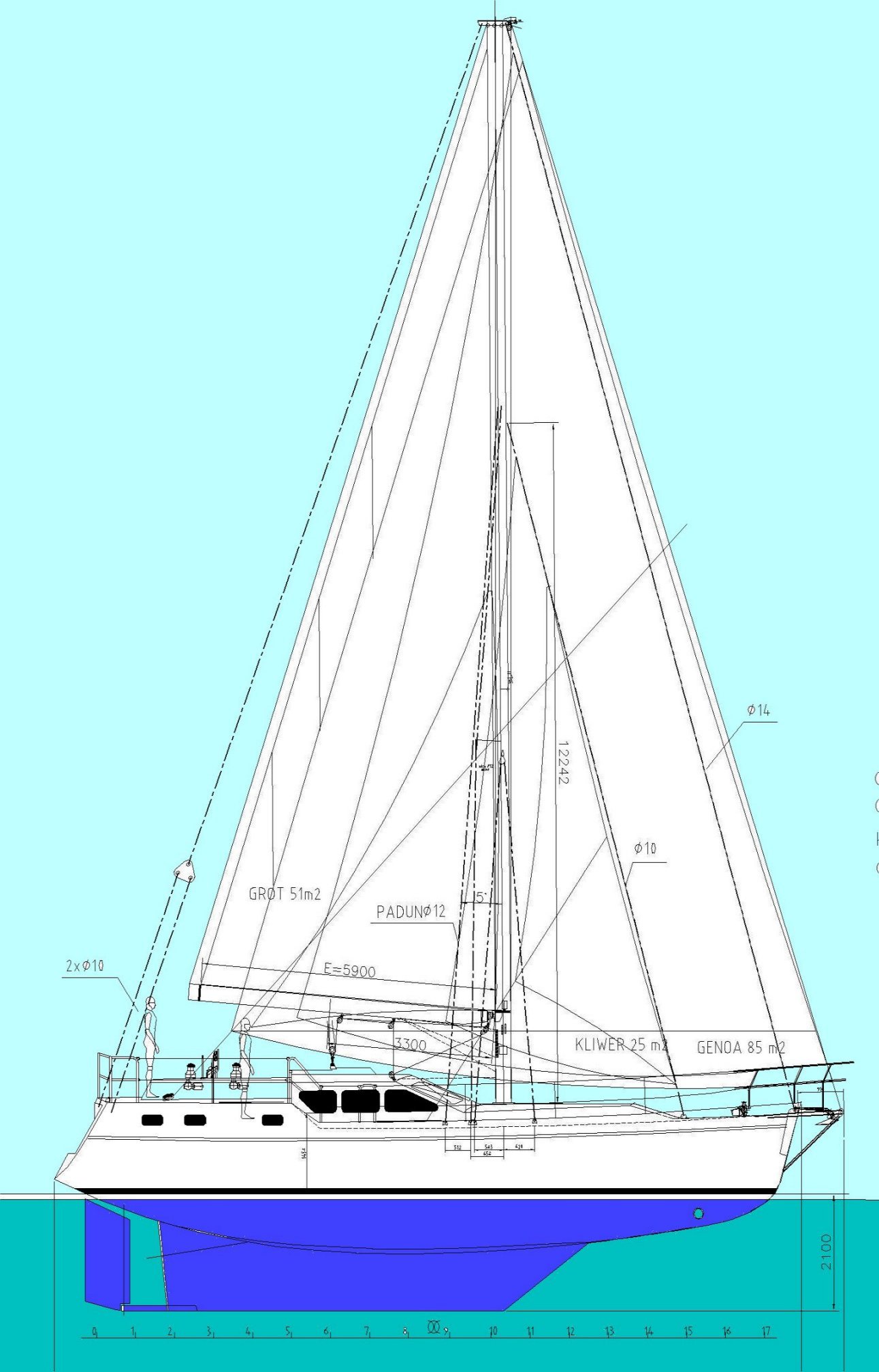 "(...)Napęd żaglowy to jednomasztowy, topowy takielunek typu kuter. Żagle podstawowe to grot rolowany w maszcie o pow. 51m2, genoa rolowana na forsztagu o pow. 85m2 i kliwer 25 m2 na kuter sztagu(...)"