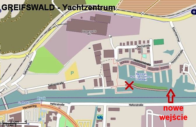 Marina miejska (Y-bomy) jest fantastycznie zaciszna i otoczona kolorowymi kamieniczkami, choć ma w tej chwili wejście w innym miejscu niż wynika to z Twojej mapki - przekopane zostało wejście bliżej mostu w Wieck, a dotychczasowe wejście - przegrodzone mostkiem. (aktualna mapka w załączeniu). Biuro Hafenmaistera jest nad samą rzeką, a sanitariaty (elektroniczny token wejściowy + prysznic na monety 1EUR), trochę w głębi, tak jakby między budynkami stoczni Hanse. Można cumować też na samej rzece Ryck, tuż przed biurem Hafenmeistera ale trzeba mieć dłuuugie cumy, bo dalby są dostosowane do naprawdę dużych jachtów.