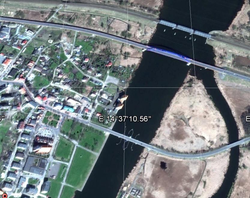 Na obrazku z Google Earth widac mosty - ten najniższy to zwodzony, środkowy to wysoki most drogowy "wina Tuska", a górny to niski (bodajże 12,5 m) kolejowy. Długa keja na lewym brzegu do keja miejska, poniżej obrazka po lewej zbudowano zima nową marinę.