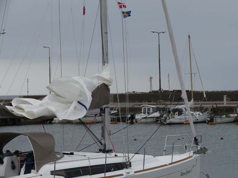 Wchodzący jacht „Baltica Yachts III” firmy czarterowej balticayachts.pl widziałem potem w porcie. Facetowi musiało się bardzo spieszyć, bo żagle rozrzucone (przez cały dzień, sprawdzałem, i to nie tylko ja, bo było jeszcze parę osób, którym się ten szczegół rzucił w oczy), jacht otwarty z powłączanym wszystkim, co można sobie włączyć, a w środku żywego ducha. Typ pewnie, jak obiecywał, patrzył jak wygląda w porcie.