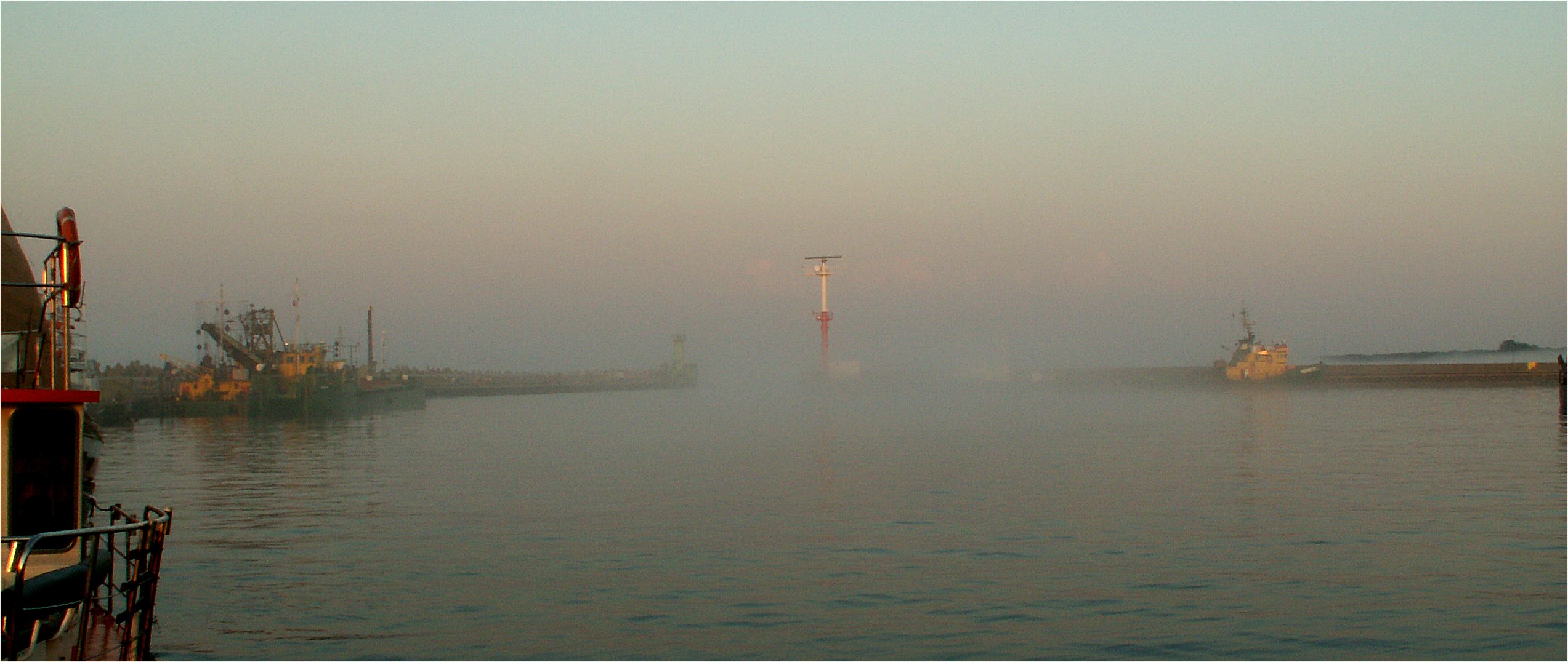 Fotociekawostka. Ze dwie mile na wschód od Władysławowa w słoneczny upalny dzień w przybrzeżnych oczeretach przyroda uruchamia wytwornicę mgły. Potem taki tuman przy słabym wschodnim wietrze odrywa się od brzegu i w ciągu kilu minut znika pogłębiarka pracująca na podejściu, przez chwilę jeszcze wystają ponad mgłę czubki masztów statków wycieczkowych i główki portu, a potem nie widać nawet dziobu własnego jachtu. Zjawisko znika po jakiejś godzinie. Zaobserwowałem je również następnego dnia. Miałem dylemat: czy włączyć silnik i ścigać się z tą mgłą, by czym prędzej znaleźć się w porcie, czy przeczekać na kotwicy za wschodnim falochronem, gdzie ze względu na płycizny raczej nikt nie pływa i zrobić jeszcze kilka lepszych zdjęć. Wybrałem to gorsze rozwiązanie…