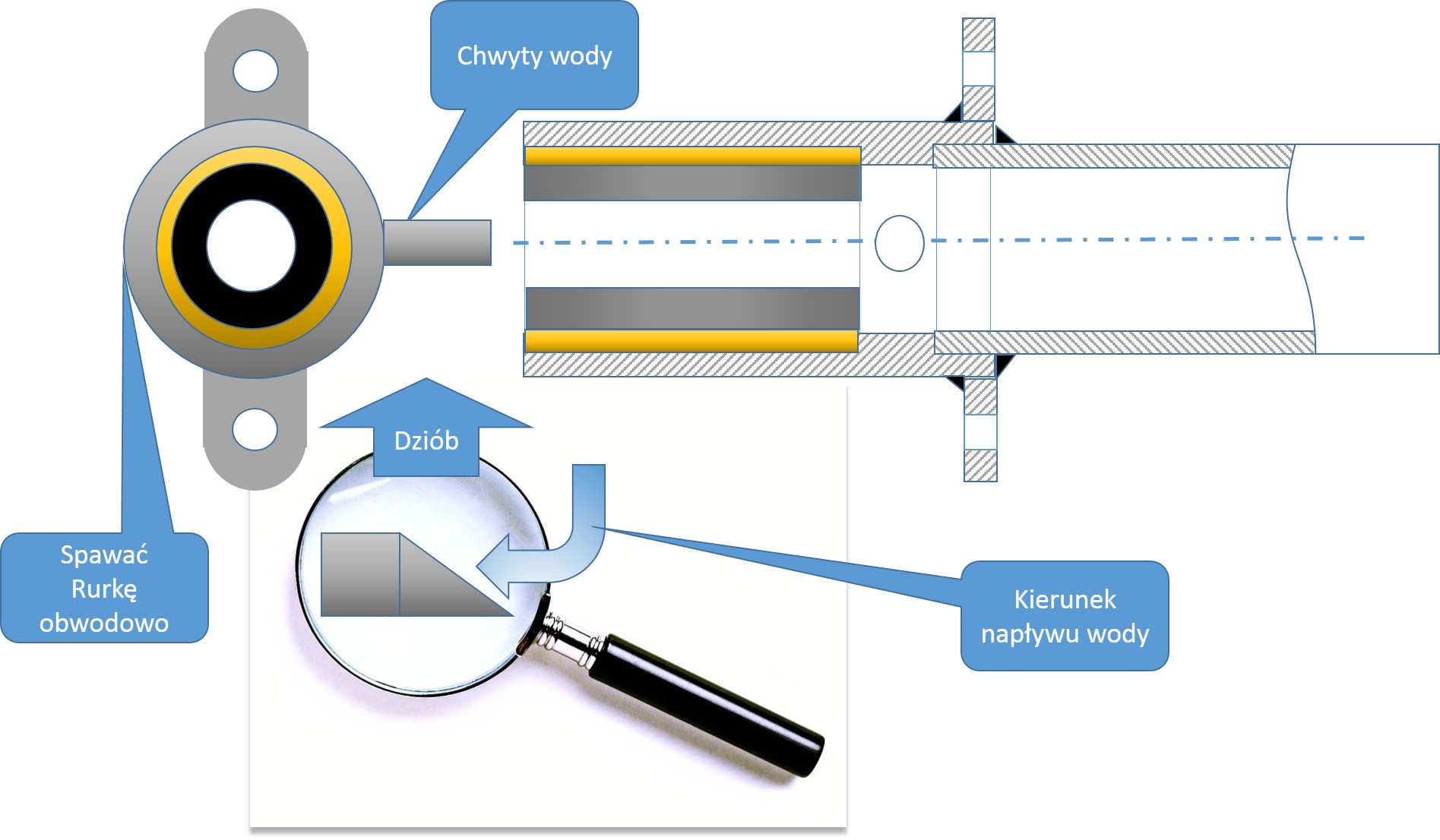 Wariant drugi zakłada, że woda jest pobierana przez chwyt rurkowy wspawany w obudowę łożyska.