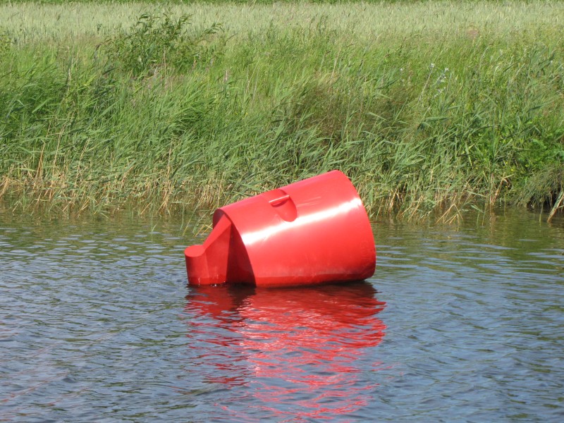 Na Szkarpawie w tym sezonie pojawiły się nowe czerwone i zielone boje. Boje są jakieś dziwne, bo widać, że ich ustawienie tak by pływały we właściwej pionowej pozycji przekracza możliwości Zarządu Dróg Wodnych – wszystkie czerwone walce leżą na boku.