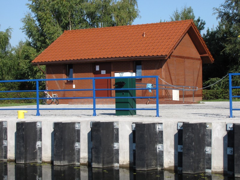 W tejże Rybinie jest też pachnące nowością stumetrowe, eleganckie, betonowe nabrzeże. Na nabrzeżu stoi ładny ceglany budynek z toaletami. Jest prąd, woda na kei, pompa do odbioru fekaliów, ławeczki, lampy, trawnik, wieszaki na koła ratunkowe. Super. Kół ratunkowych na wieszakach wprawdzie nie ma – bo przecież ukradliby, ale to nieistotny szczegół (póki ktoś się nie utopi). Szkoda natomiast, że w budynku nie ma pryszniców.