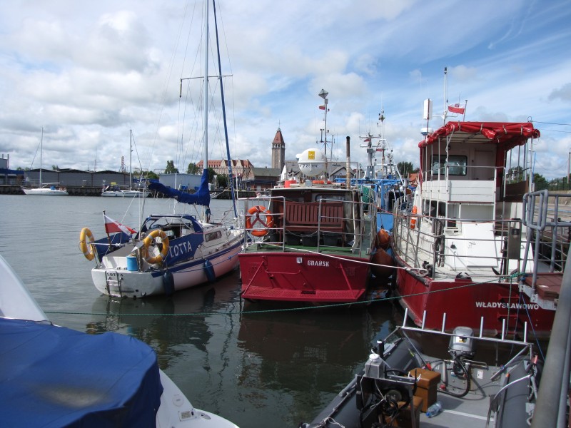 Władysławowo: miejsc w y-bomach przy krótkim pomoście pływającym brak, mimo że wpływam wczesnym popołudniem. Przy wszystkich nabrzeżach, z wyjątkiem wysokiego nabrzeża „przeładunkowego” stoją kutry rybackie oraz motorówki „dorszowe”. Proszę przez radio o wskazanie miejsca, gdzie mogę stanąć. Bosmanat informuje, że w takich sytuacjach należy wołać „Port Serwis”. "Port serwis" wskazuje miejsce na trzeciego przy dwóch kutrach, a uprzejmy pan pojawia się na wskazanym kutrze by odebrać cumy.