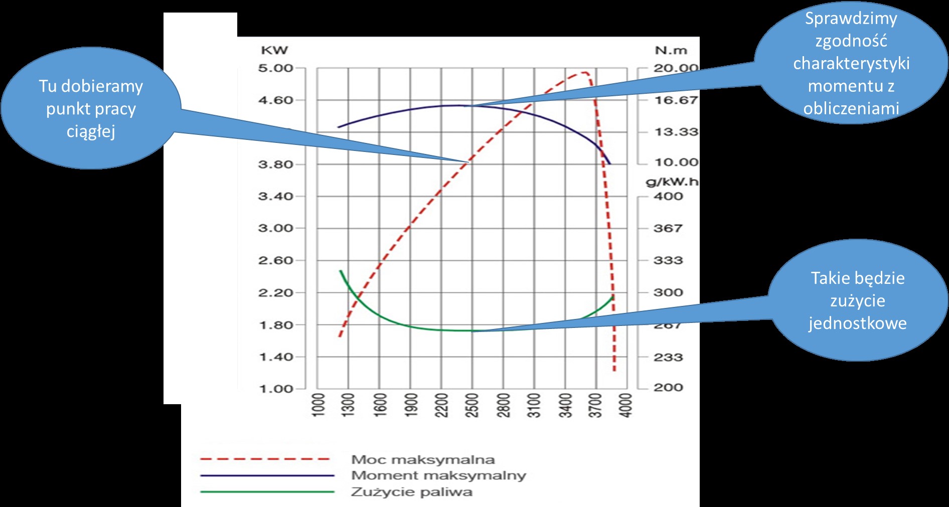 Dobrałem dla tego silnika punkt pracy ciągłej w drodze na Pańskie łowisko tak, aby pokrywał się on z maksymalnym momentem obrotowym ponieważ wtedy silnik pracuje najekonomiczniej oraz najmniej się zużywa.