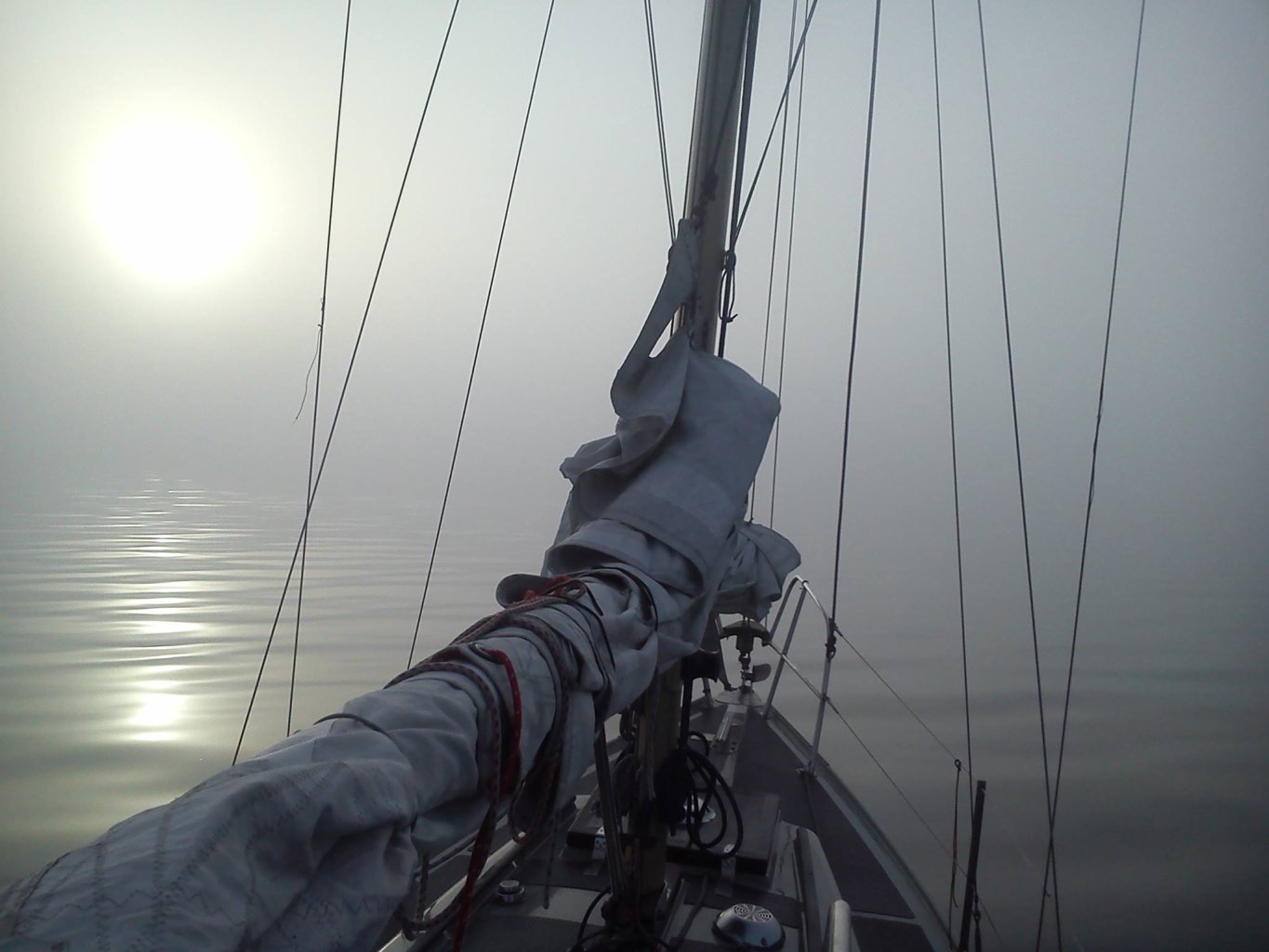 Z ciężkim sercem, że to ostatni dzień pływania a my musimy słuchać kataryny, powlekliśmy się mała naprzód do Świnoujścia klarując po drodze jacht i siebie. Milę morską przed główkami portu wywołałem Świnoujście Traffic z zapytaniem, czy mnie nic nie rozjedzie w tej mgle. W odpowiedzi uzyskałem informację, że do portu płynie "Kopernik", ale jest jeszcze dość daleko więc możemy wchodzić, mają nasze silne echo na radarze i w razie czego będą asystować. Przywdziałem więc na wszelki wypadek „moje brązowe spodnie”, wysłałem dwóch załogantów na dziób w celu macania rękami wody przed dziobem i trzymając kurs kompasowy ruszyliśmy od pławy do pławy nie widząc brzegów dookoła siebie. Znaki nawigacyjne wyłaniały się jakieś 10 m od nas a z odległości 5 m nawet dawało się zorientować, że świecą. Świnoujście Traffic wywołało nas w okolicy pławy A, że powinniśmy już ją widzieć i możemy zakręcać do portu oraz na wysokości latarni morskiej, że dotarliśmy do wejścia basenu JK "Czterech Wiatrów". Podziękowaliśmy, rzuciliśmy cumy i... pół godziny później wiatr rozwiał całą mgłę.