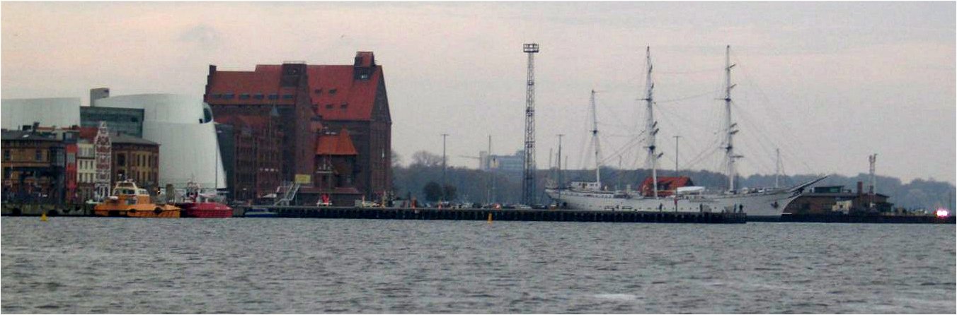 Po wyjściu z portu ciąg dalszy żeglugi przez „labirynt”, tym razem przy nieco silniejszym wietrze. Na początku wyciągamy miłe pięć węzłów, później wiatr zaczyna słabnąć i spowalnia nas do czterech by po południu prawie zupełnie zdechnąć. Wewnątrz Stralsundu bujaliśmy się już tylko niecałe dwa knoty. Mieliśmy spory zapas do godziny otwarcia mostu więc oszczędzaliśmy paliwo delektując się wspaniałą ciszą otaczającej nas jesiennej przyrody. Po drodze wyprzedziła nas motorówka lokalnych służb celnych, z którą wymieniliśmy przyjazne machnięcie ręką i znów, aż do samego miasta, zostaliśmy na wodzie sami ze sobą.