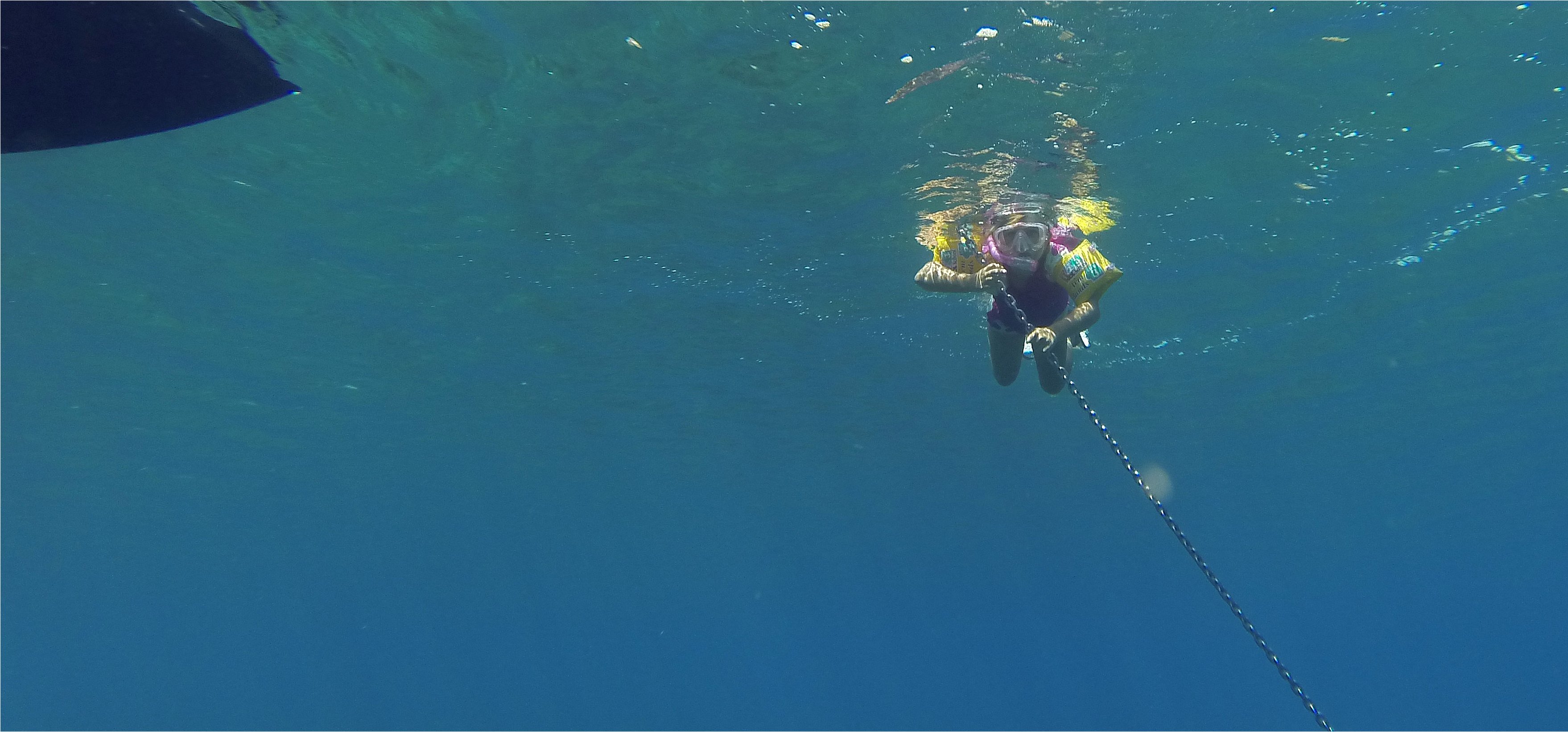 Młodsza Antonina stała się osowiała i zaczęła mieć pierwsze objawy choroby morskiej. Wiatr odszedł i nie byłem pewien czy uda sie podejść jednym halsem do wysp. Po dwóch kolejnych godzinach doszliśmy na południe od archipelagu. Około 2 mil pod wiatr mieliśmy osłonięte (według naszego Greka) kotwicowisko, zrzuciliśmy więc żagle i na silniku podeszliśmy pod północną wyspę Arpia. Głębokości powoli spadały aż doszliśmy dość blisko brzegu i aby mieć możliwość bezpiecznego łukowania na kotwicy postanowiłem rzucić kotwicę na 6 metrach. Rozkołys wchodził do zatoki marszcząc powierzchnię wody, normalnie bardzo przejrzystej i klarownej. Nie widziałem więc dna. Owszem Rod Heikell pisał o kamieniach na dnie, ale to co się tam znajdowało przeszło moje najśmielsze oczekiwania. Mam w zwyczaju po rzuceniu kotwicy wchodzić do wody i pooglądać sobie jak leży i trzyma. Po założeniu maski ukazał mi się podwodny widok wielkich i płaskich głazów podwodnych, z których niektóre miały pod 2 matry wysokości. Gdybym chaił się zatrzymać na 3-4 metrach? Brrrr…. Na szczęście nasz kotwica upadła na jedno z niewielu miejsc, gdzie dno było czyste i do tego jeszcze dość ładnie była zacięta. Gorzej było z łańcuchem, który wchodził pod załomy głazów. No nic. Stoimy.