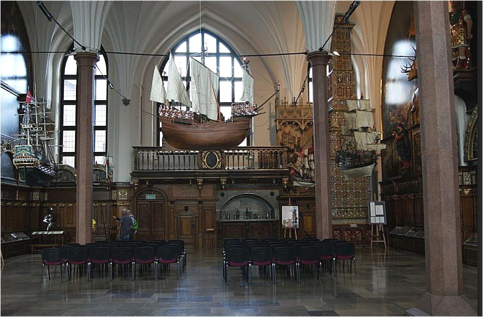 Wnętrze Dwóru Artusa w Gdańsku należy do najbardziej godnych, nie sakralnych w Polsce. Wzniesiony około 1350 roku - należał do Bractwa św. Jerzego, kultywującego tradycję arturiańską m. in. poprzez urządzanie turniejów rycerskich wg porządku Okrągłego Stołu. Po pożarze w 1476 roku, został odbudowany w 1481 roku. Nowy Dwór Artusa, wzniesiony na rzucie nieregularnego prostokąta, otrzymał formę trójnawowej hali o powierzchni ok. 400m2 i wysokości 12 m. Powstała wówczas bryła budynku zachowała się do dnia dzisiejszego.