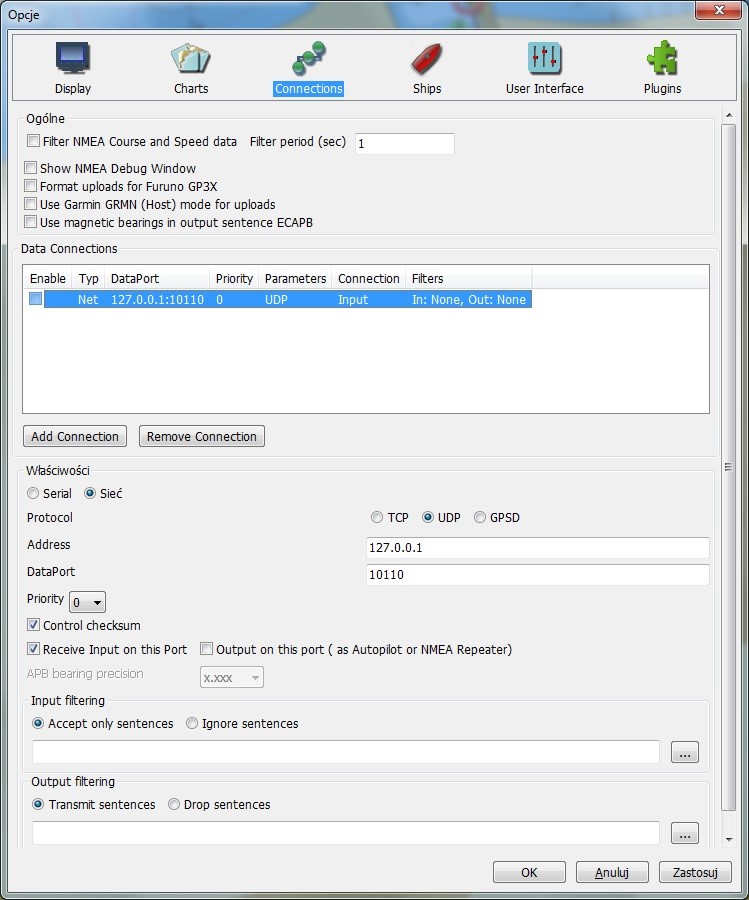 W polach Address i Port wpisujemy wartości określone w konfiguracji PNAIS-a, wybieramy protokół UDP. Dla kontroli odebranych danych możemy zaznaczyć okno Show NMEA Debug Window.