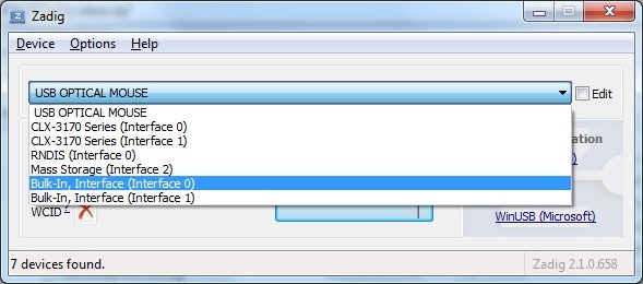 Na rozwijanej liście urządzeń powinny pojawić się dwa nowe urządzenia. W moim przypadku (Win7pro) pojawiły się dwa nowe interfejsy Bulk-In, Interface (Interface 0) i Bulk-In, Interface (Interface 1) tak jak na poniższym obrazku: