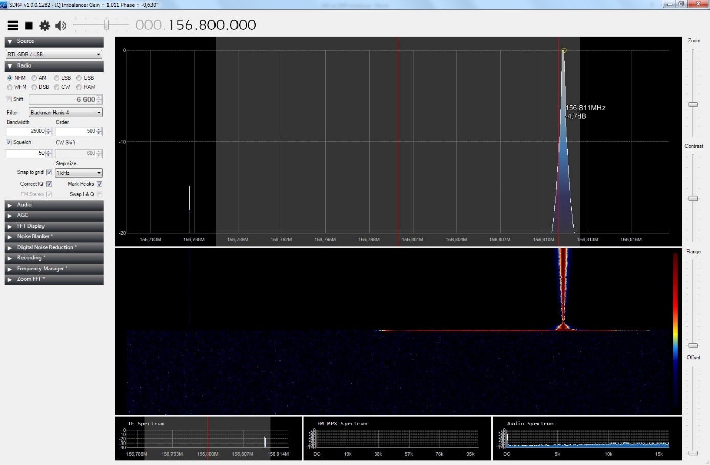W zakładce Radio wybieramy parametry posiadanego źródła sygnału wzorcowego. W tym przypadku źródłem jest radyjko ręczne IC-M3A na kanale 16. Wybieramy modulację NFM, pasmo (Bandwith) 25000 i częstotliwość sygnału 156,8MHz. Czyli częstotliwość odbioru kanału 16.